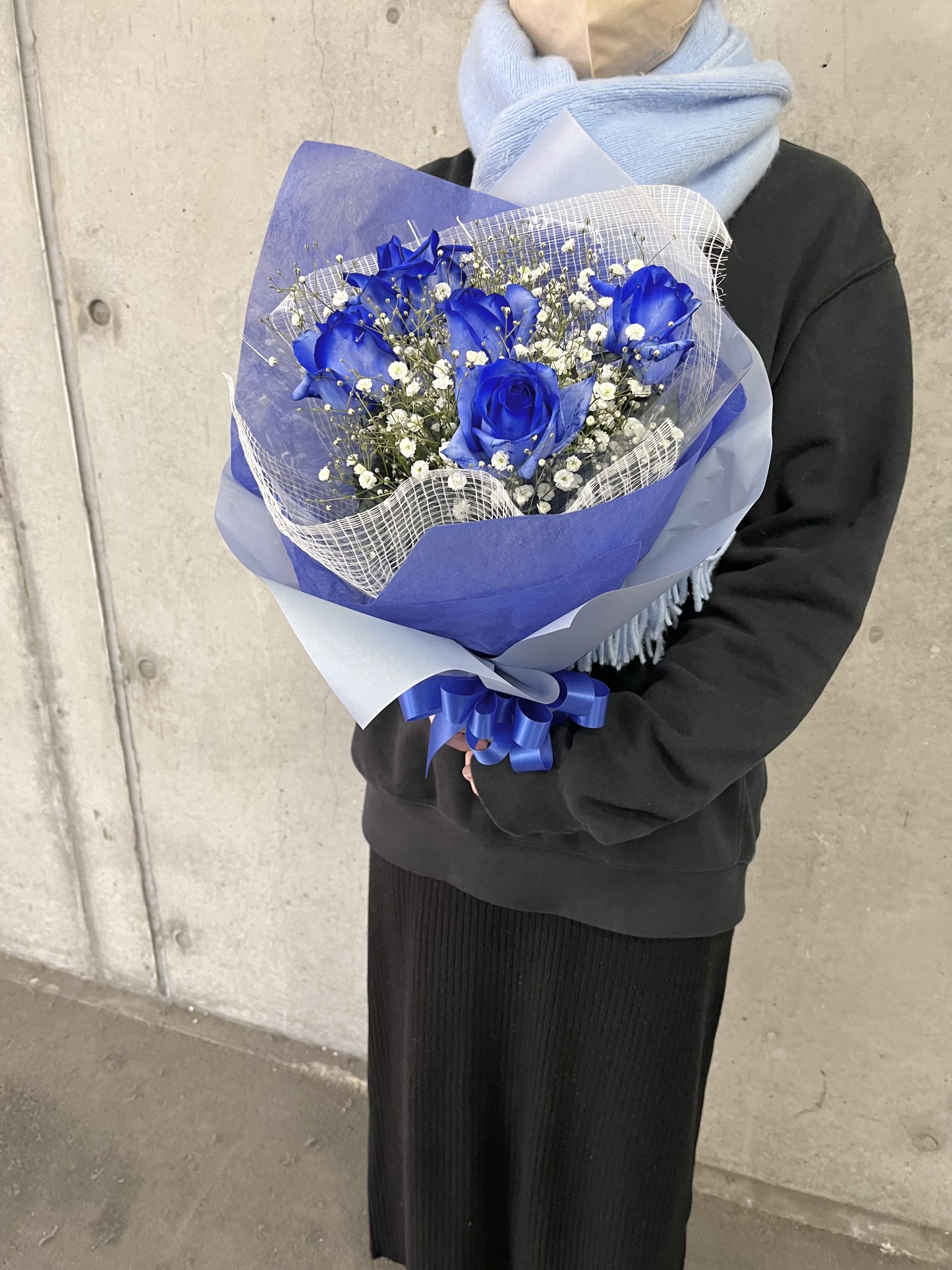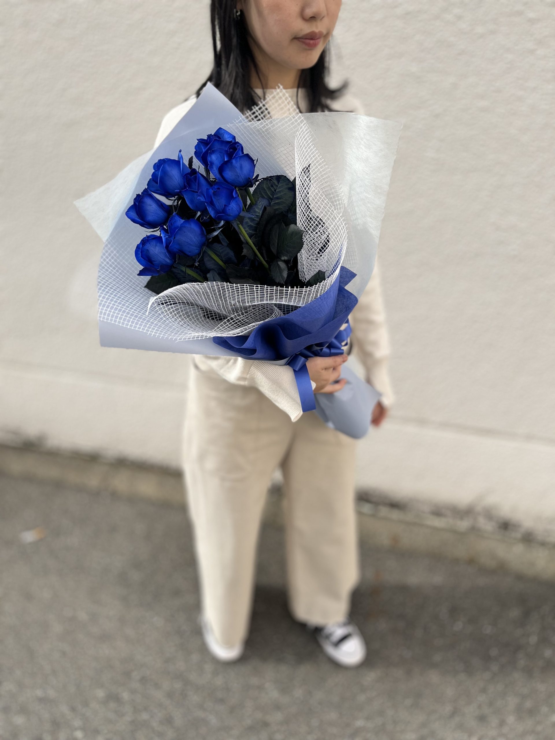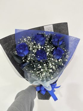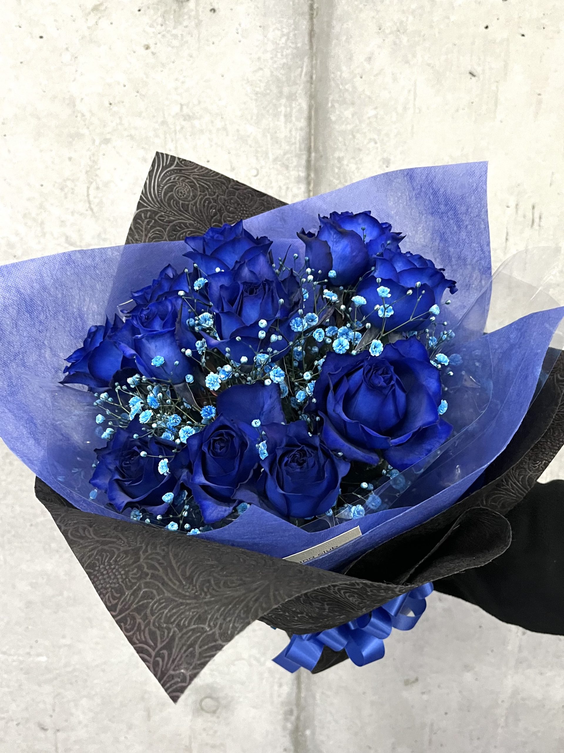 深い青が際立つ青薔薇の花束。