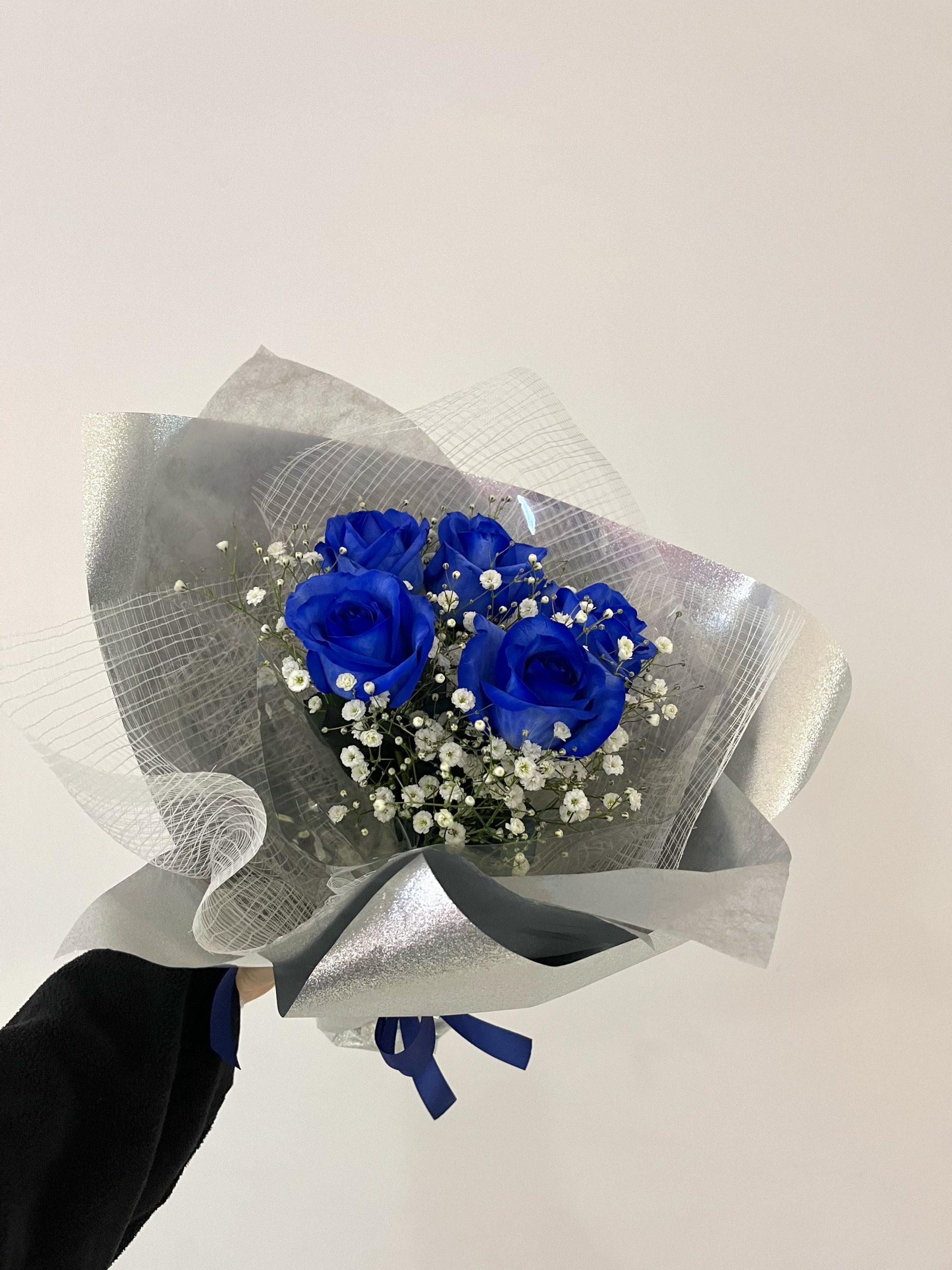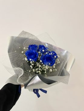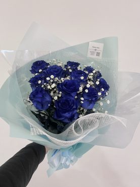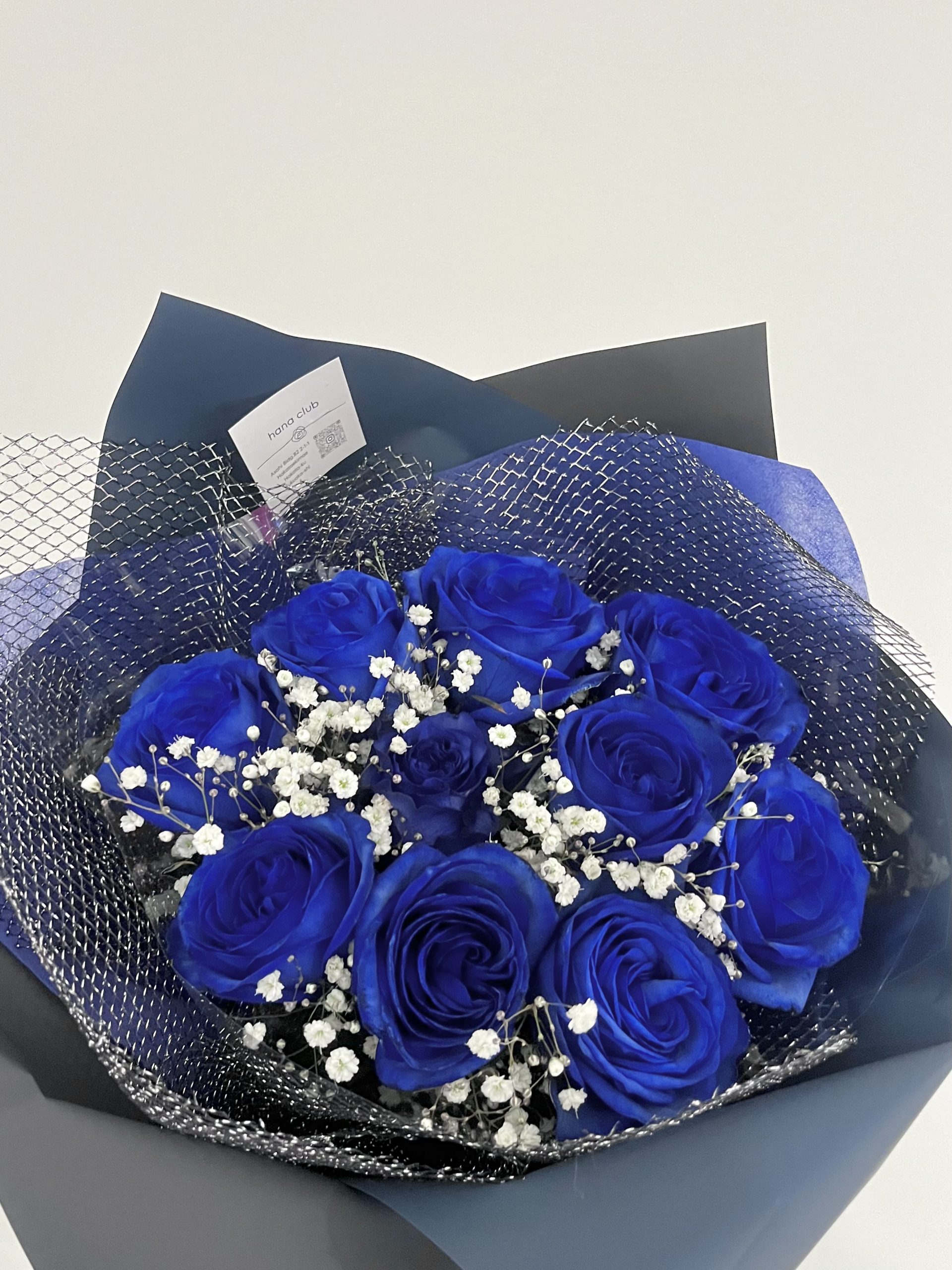 深い青が際立つ青薔薇の花束。